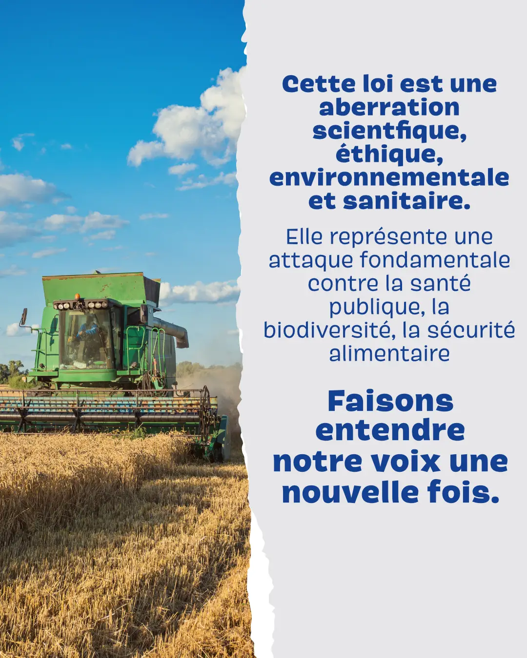 Cette loi est un recul scientifique, environnemental et sanitaire. Elle menace la santé publique, la biodiversité et l’avenir de notre agriculture. La mobilisation a déjà été massive. Mais ce n’est pas fini. Chaque signature compte pour relancer le débat à l’Assemblée nationale. Nous avons le pouvoir de faire entendre notre voix, encore une fois. Signez et partagez autour de vous !